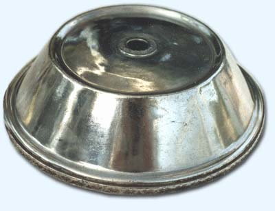 Item number 917 SILVERWARE SERVICE DINNER PLATE COVERS 10 1/8 in. diameter. Shell pattern around finger hole and edge. Marked "United States Lines" inside. Nickel silver. Silver soldered. Heavy - really keeps food warm. 4 lbs. $65.00 |